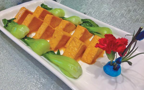 Surprisingly, there was also a bean curd dish, with wedges of lightly deep-fried golden tofu served with a savory sauce. I also liked the fruit pilaf, a fragrant platter of rice garnished with dried apricots, raisins, almonds and walnuts.