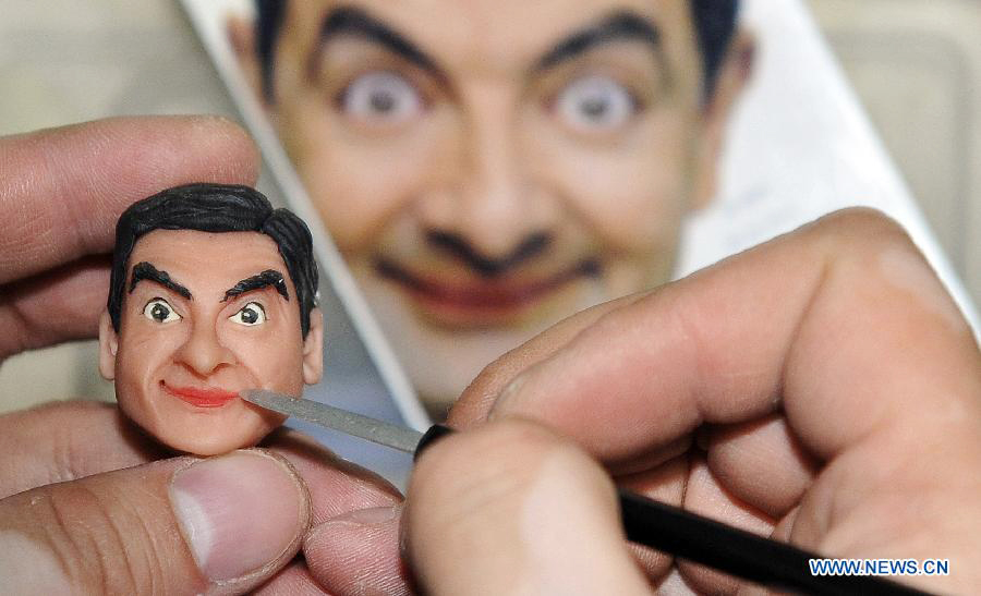 Zhang Hongming (R), a dough modelling craftsman, works on a dough figurine of Mr. Bean at his studio in Changchun, capital of northeast China's Jilin Province, Dec. 1, 2013. 33-year-old Zhang started nine years ago to make a living by making dough modellings, a skill he learned from a travelling craftsman, after he got laid-off from his post at a grain depot. Now Zhang is already a famous dough modelling master in Jilin with his works going into museum collections. (Xinhua/Wang Haofei)