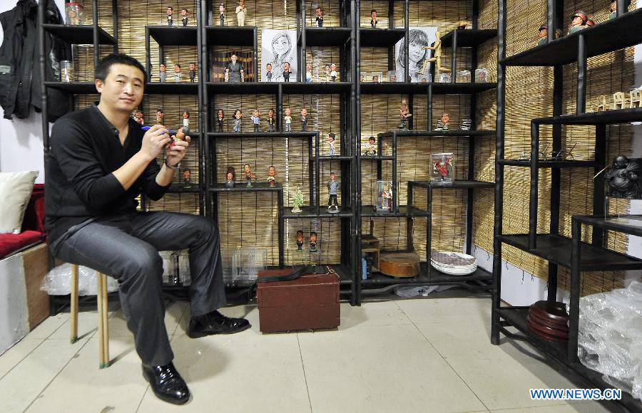 Zhang Hongming, a dough modelling craftsman, displays his works at his studio in Changchun, capital of northeast China's Jilin Province, Dec. 1, 2013. 33-year-old Zhang started nine years ago to make a living by making dough modellings, a skill he learned from a travelling craftsman, after he got laid-off from his post at a grain depot. Now Zhang is already a famous dough modelling master in Jilin with his works going into museum collections. (Xinhua/Wang Haofei)