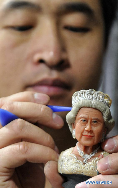 Zhang Hongming, a dough modelling craftsman, works on a dough figurine of Queen Elizabeth II at his studio in Changchun, capital of northeast China's Jilin Province, Dec. 1, 2013. 33-year-old Zhang started nine years ago to make a living by making dough modellings, a skill he learned from a travelling craftsman, after he got laid-off from his post at a grain depot. Now Zhang is already a famous dough modelling master in Jilin with his works going into museum collections. (Xinhua/Wang Haofei)