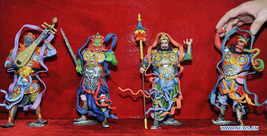 Photo taken on Dec. 1, 2013 shows figurines made by Zhang Hongming, a dough modelling craftsman in Changchun, capital of northeast China's Jilin Province. 33-year-old Zhang started nine years ago to make a living by making dough modellings, a skill he learned from a travelling craftsman, after he got laid-off from his post at a grain depot. Now Zhang is already a famous dough modelling master in Jilin with his works going into museum collections. (Xinhua/Wang Haofei)