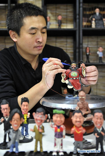 Zhang Hongming, a dough modelling craftsman, works on a dough figurine at his studio in Changchun, capital of northeast China's Jilin Province, Dec. 1, 2013. 33-year-old Zhang started nine years ago to make a living by making dough modellings, a skill he learned from a travelling craftsman, after he got laid-off from his post at a grain depot. Now Zhang is already a famous dough modelling master in Jilin with his works going into museum collections. (Xinhua/Wang Haofei)