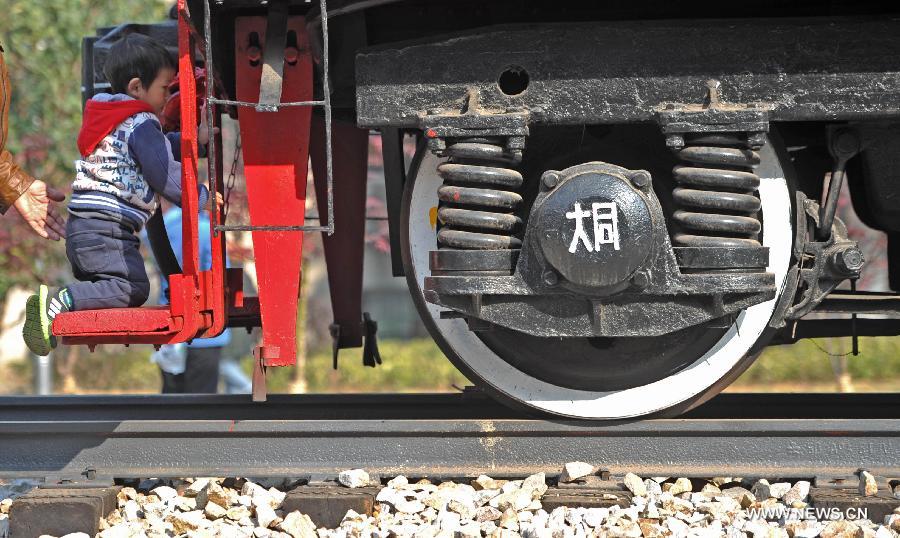 A boy plays near a vintage locomotive at Central South University, in Changsha, capital of central China's Hunan Province, Dec. 4, 2013. 3 featured locomotives were displayed here on Wednesday, respectively representing the 3 phases of China's train development history. (Xinhua/Li Ga)