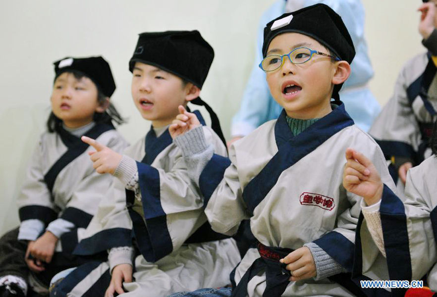 Students wearing traditional costumes from Han Dynasty (202 B.C.-220 A.D.) have class at a private school in Changsha, capital of central China's Hunan Province, Dec. 7, 2013. A group of children under the age of 12 learn courses of Chinese traditional culture during weekends at a newly-opened private school in Changsha. (Xinhua/Li Ga)
