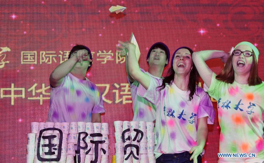 Foreign students perform during a competition of Chinese programmes at the International College of Jilin University in Changchun, capital of northeast China's Jilin Province, Dec. 12, 2013. A total of 320 students from 46 countries participated in the competition. (Xinhua/Wang Haofei)