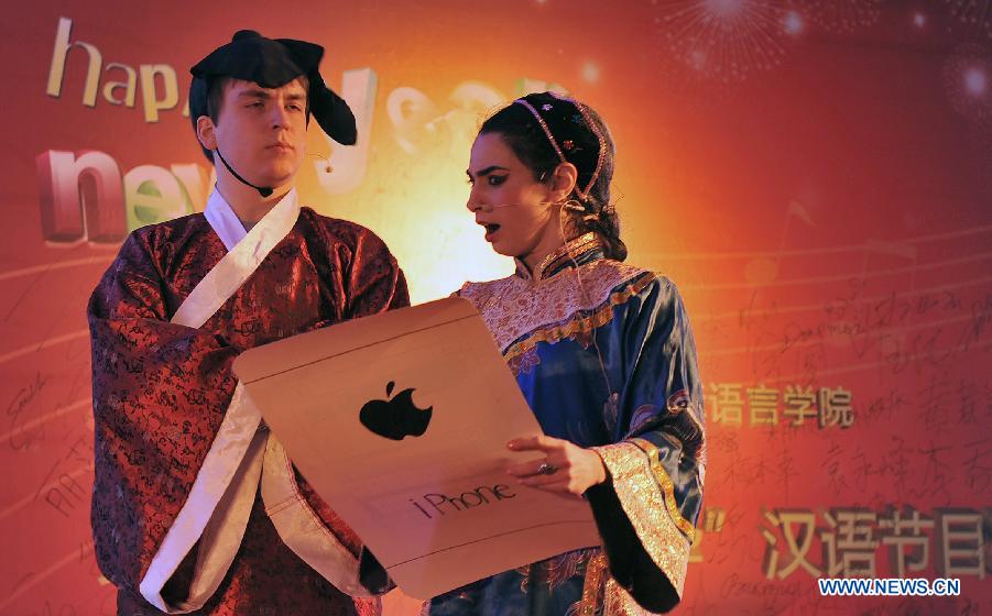Foreign students perform during a competition of Chinese programmes at the International College of Jilin University in Changchun, capital of northeast China's Jilin Province, Dec. 12, 2013. A total of 320 students from 46 countries participated in the competition. (Xinhua/Wang Haofei)
