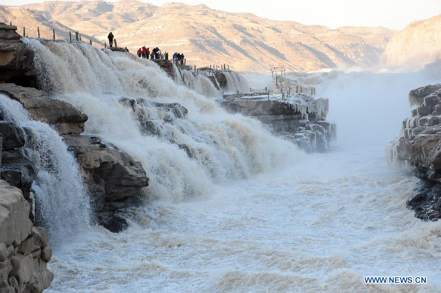 Visitors view the magnificent scenery of Hukou Waterfall, a section of the middle reaches of the Yellow River, in Yichuan County, northwest China's Shaanxi Province, Dec. 12, 2013. It is the first year that the Yichuan Hukou Waterfall Scenic Area of Shaanxi is open to tourists in winter. (Xinhua/Ding Haitao)