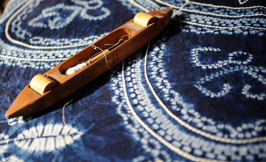 Photo taken on Dec. 12, 2013 shows a tie-dye product and a weaving shuttle of Duan Yinkai, an inheritor of the tie-dye technique, in a dyehouse in Bai Autonomous Prefecture of Dali, southwest China's Yunnan Province. Duan learnt the tie-dye technique from her parents, and she started to work on it when she was 17 years old. In the following years, not only did Duan create new colors and categories, she also imparted her experience to her prentices. As a traditional folk technique of the Bai ethnic group, tie dye was listed in 2006 into state-level intangible cultural heritages. Nowadays, with the development of color pad dyeing technique, tie-dye products present locals and tourists with a more colorful and charming characteristic. [Photo/Xinhua]