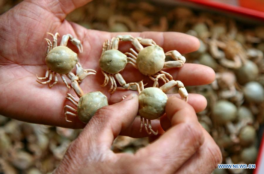 Du Baohuai, a fisherman at Jijiabao Village, selects crab carapaces suitable for painting in Huanghua City, north China's Hebei Province, Dec. 14, 2013. Du has become a famous "fisherman artist" for his crab carapace handicrafts. (Xinhua/Sun Fuxin)