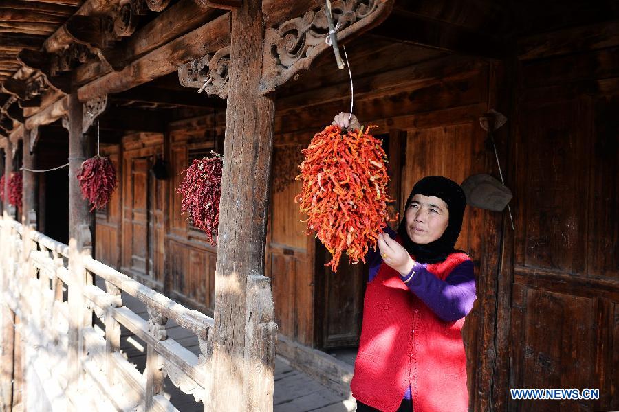 A woman picks the peppers hung for drying at her wooden fence dwelling in Dazhuang Village of Salar Autonomous County of Xunhua, northwest China's Qinghai Province, Dec. 13, 2013. Dated from the Ming (1368-1644) ang Qing (1644-1911) dynasties, wooden fence dwellings have played an important role in Salar people's daily life. Salar people's wooden fence dwellings, named after the vine-knitted walls, are of great value in the study of Salar people's economy, culture and history. (Xinhua/Wu Gang)