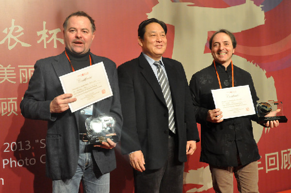 George Doupas (3rd, L) and Stephen Shaver (1st, L), both first prize winners, pose for pictures at the award ceremony of the 2013 Beautiful Beijing in the Eyes of Foreign Friends Photo Contest held in Beijing on Dec. 12, 2013. The photo contest was hosted by the Beijing People's Association for Friendship with Foreign Countries. (Photo by Zhang Junmian/China.org.cn)