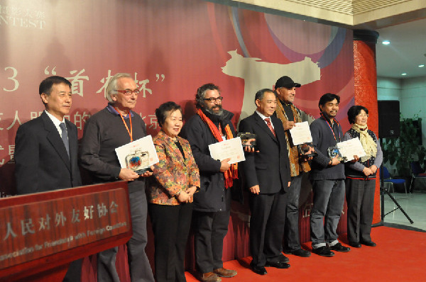 The second prize winners pose for pictures at the award ceremony of the 2013 Beautiful Beijing in the Eyes of Foreign Friends Photo Contest held in Beijing on Dec. 12, 2013. The photo contest was hosted by the Beijing People's Association for Friendship with Foreign Countries. (Photo by Zhang Junmian/China.org.cn)