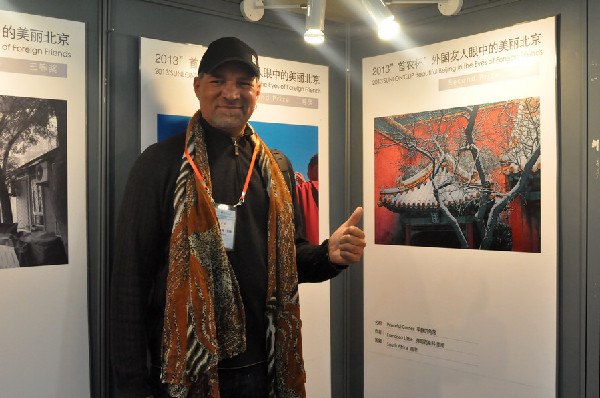 Francisco Little from South Africa poses with his work "Peaceful Corner". (Photo by Zhang Junmian/China.org.cn)
