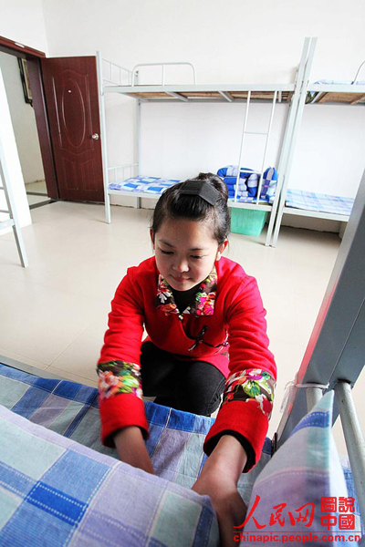 Daiye folds her quilt. (Photo/Chinapic.people.com.cn)