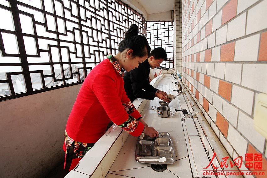 Students wash dishes after breakfast at 7:35 a.m. (Photo/Chinapic.people.com.cn) |