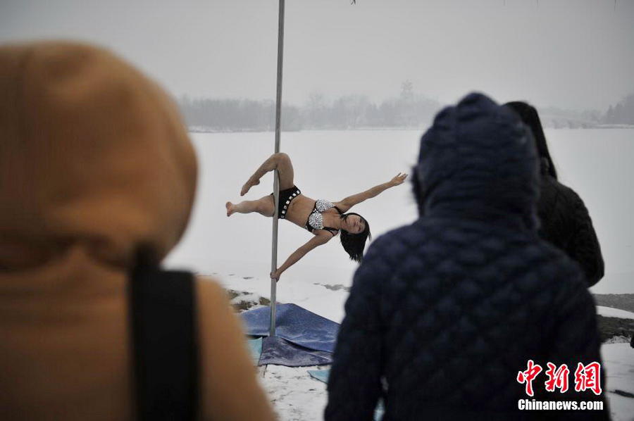 Led by Chinese national pole dancing team, trainees from China Pole Dance Sports & Training Center show their moves in Tianjin Water Park, Dec. 17, 2013. Tianjin witnessed its first snowfall in this winter on Tuesday. (Chinanews.com/Tong Yu)