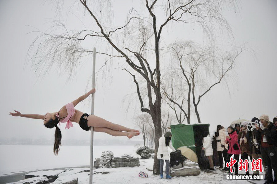 Led by Chinese national pole dancing team, trainees from China Pole Dance Sports & Training Center show their moves in Tianjin Water Park, Dec. 17, 2013. Tianjin witnessed its first snowfall in this winter on Tuesday. (Chinanews.com/Tong Yu)