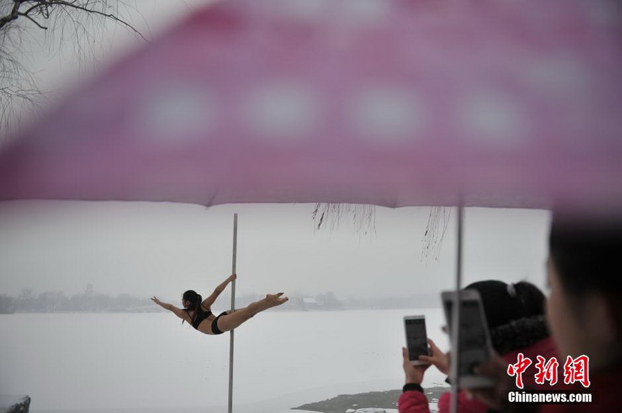 Led by Chinese national pole dancing team, trainees from China Pole Dance Sports & Training Center show their moves in Tianjin Water Park, Dec. 17, 2013. Tianjin witnessed its first snowfall in this winter on Tuesday. (Chinanews.com/Tong Yu)