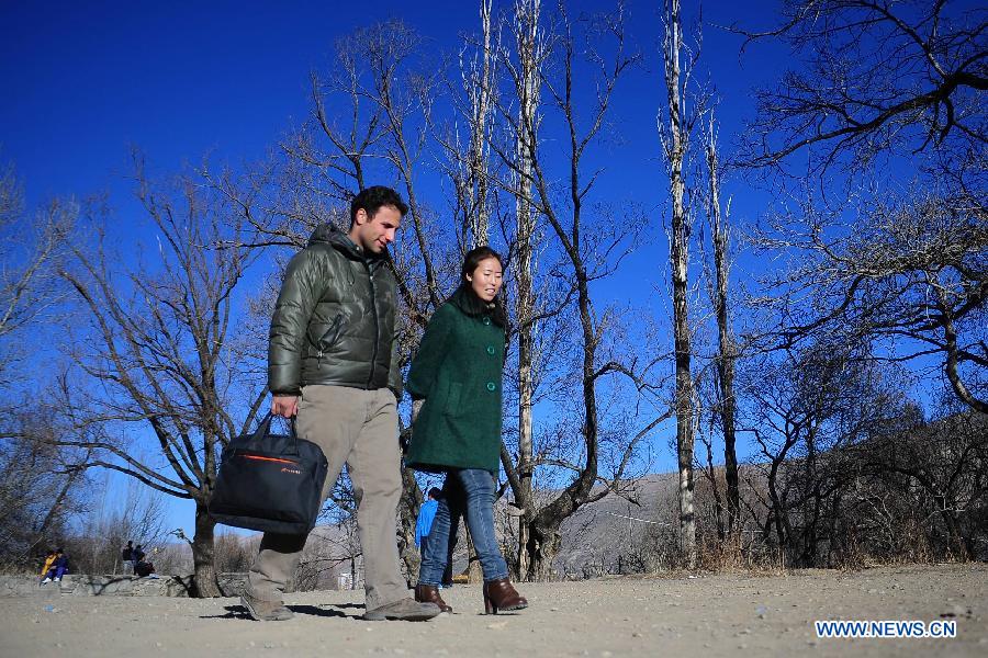 Andrew (L) walks with a workmate on a square at the Second Minzu Middle School in the Tibetan Autonomous Prefecture of Huangnan, northwest China's Qinghai Province, Dec. 17, 2013. The 29-year-old Andrew Frankel from America has always showed interests in Tibetan culture. In 2012, he left his hometown for Qinghai and became a teacher at school. Apart from teaching English classes, he established an English books corner and a movie club, creating better English-studying atmosphere for local students. "I love staying with my students," Andrew said as he found the two-year teaching experience was valuable to his life. (Xinhua/Li Shaopeng)