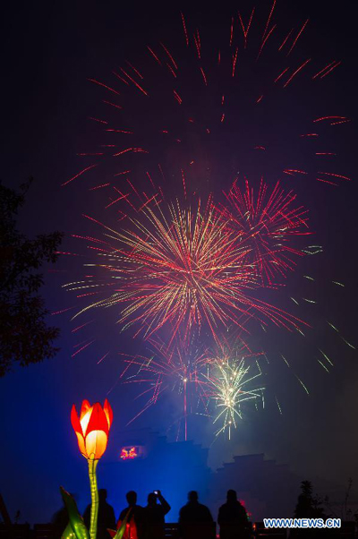 People watch fireworks during a lamp festival in Hefei, capital of east China's Anhui Province, Dec. 18, 2013. (Xinhua/Du Yu)