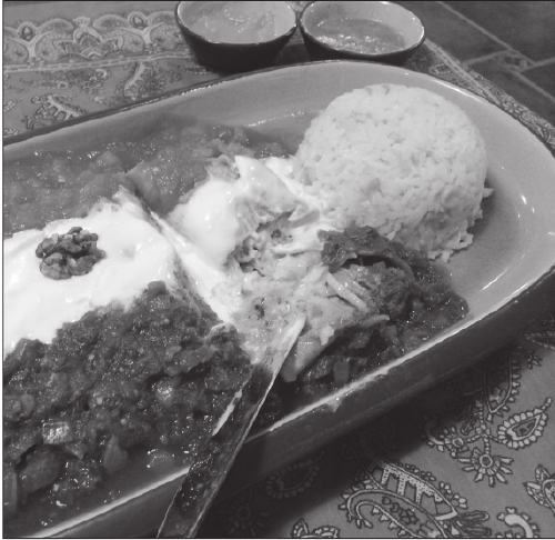Enchiladas shimmer with the green, white and red colors of the Mexican flag. |