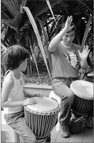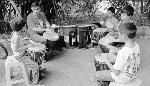 Watching a group of Chinese children playing the djembe, an African hand drum, in a park in Shenzhen is an uplifting experience. The ups and downs of the beat and the exotic rhythm produce a variety of sounds, presenting a vivid picture of Africa.