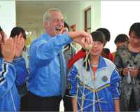 A Wutu dancer climbs over the wall to perform in a village in Tongren County in northwest China’s Qinghai Province on Dec. 22, 2013.(CNS/ Hu Guilong)