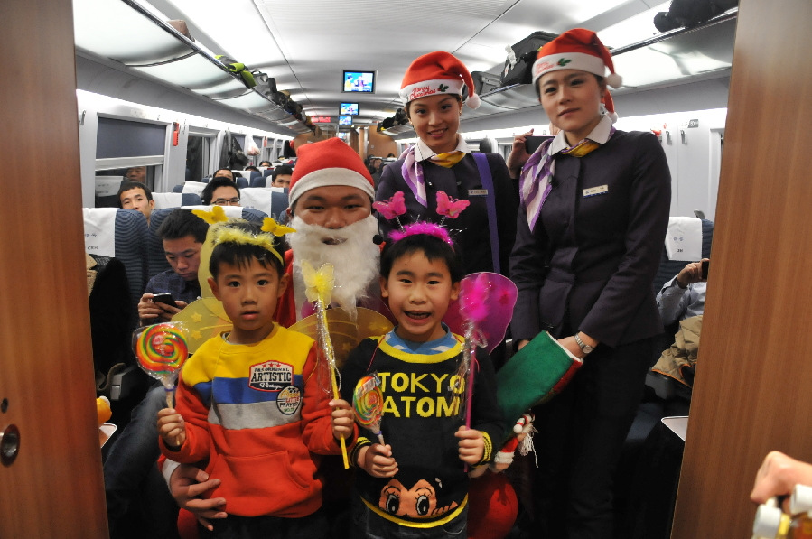 Shanghai-Beijing high-speed railway attendants celebrate Christmas Day with children on the train on Dec 23, 2013. [Photo/China.org.cn]