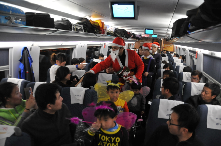 Shanghai-Beijing high-speed railway attendants celebrate Christmas Day with children on the train on Dec 23, 2013. [Photo/China.org.cn]