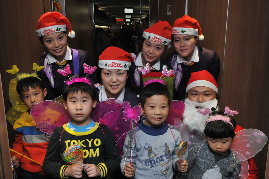 Shanghai-Beijing high-speed railway attendants celebrate Christmas Day with children on the train on Dec 23, 2013. [Photo/China.org.cn]
