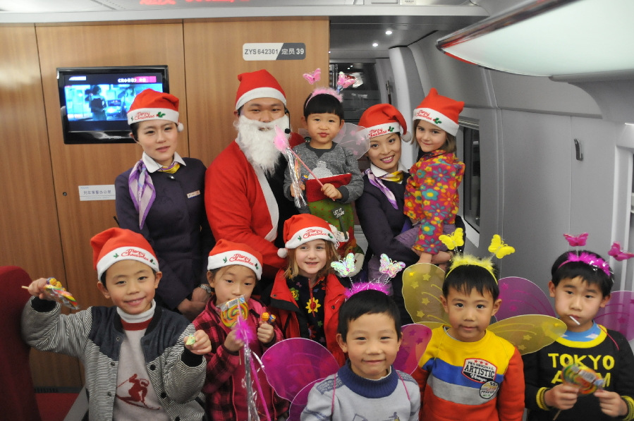 Shanghai-Beijing high-speed railway attendants celebrate Christmas Day with children on the train on Dec 23, 2013. [Photo/China.org.cn]