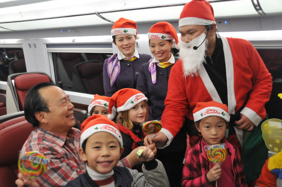 Shanghai-Beijing high-speed railway attendants celebrate Christmas Day with children on the train on Dec 23, 2013. [Photo/China.org.cn]