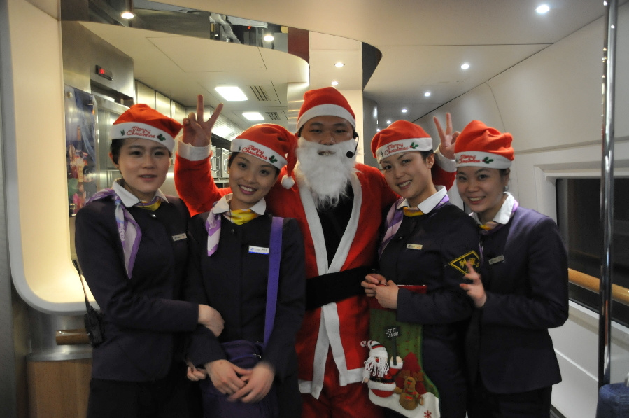 Shanghai-Beijing high-speed railway attendants celebrate Christmas Day with children on the train on Dec 23, 2013. [Photo/China.org.cn]