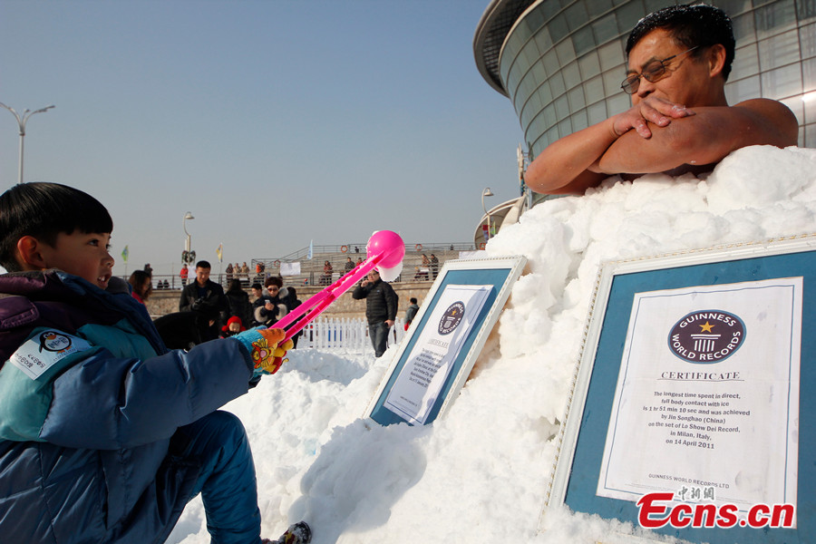 Chinese "Iceman" Jin Songhao is seen shirtless at Tianjin Haichang Polar Ocean World in north China's Tianjin municipality on Dec 24, 2013. [Photo: China News Service / Tong Yu]