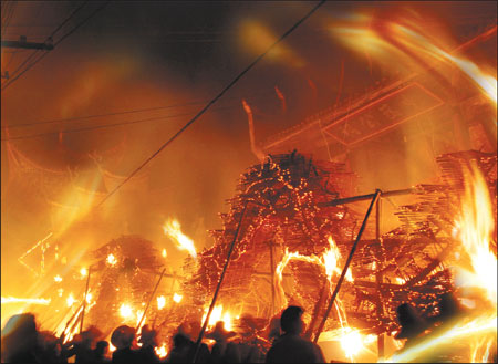 At night they turn into "fire dragons" because the carriers set them alight. People dance with them until the dragons are burned to ash.
