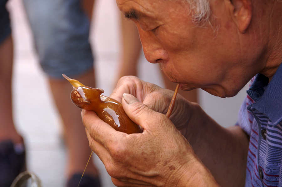An artisan blows a sugar figurine at the Ancient Cultural Street in Tianjin. [Photo by Daniel de Oliveira Possamai/provided to chinadaily.com.cn]