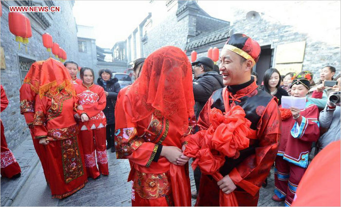 Newly-married couples attend a group wedding ceremony in Yangzhou, east China's Jiangsu Province, Jan. 1, 2014. Altogether 13 newly-wed couples took part in the traditional wedding ceremony at Geyuan Garden in Yangzhou on the first day of 2014. [Photo: Xinhua/Meng Delong]