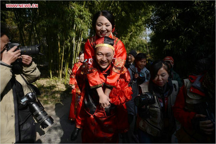 A bridegroom carries his bride during a group wedding ceremony in Yangzhou, east China's Jiangsu Province, Jan. 1, 2014. Altogether 13 newly-wed couples took part in the traditional wedding ceremony at Geyuan Garden in Yangzhou on the first day of 2014. [Photo: Xinhua/Meng Delong]