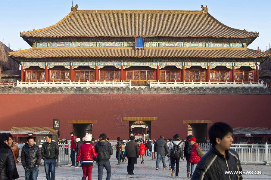 Tourists are seen in front of the Meridian Gate of the Forbidden City in Beijing on Dec. 31, 2013. The Forbidden City, also known as the Palace Museum, will be closed on Mondays since Jan. 1, 2014. But on public days and Mondays during July 1 to Aug. 31, the museum will still be opened. (Xinhua/Zhao Bing)