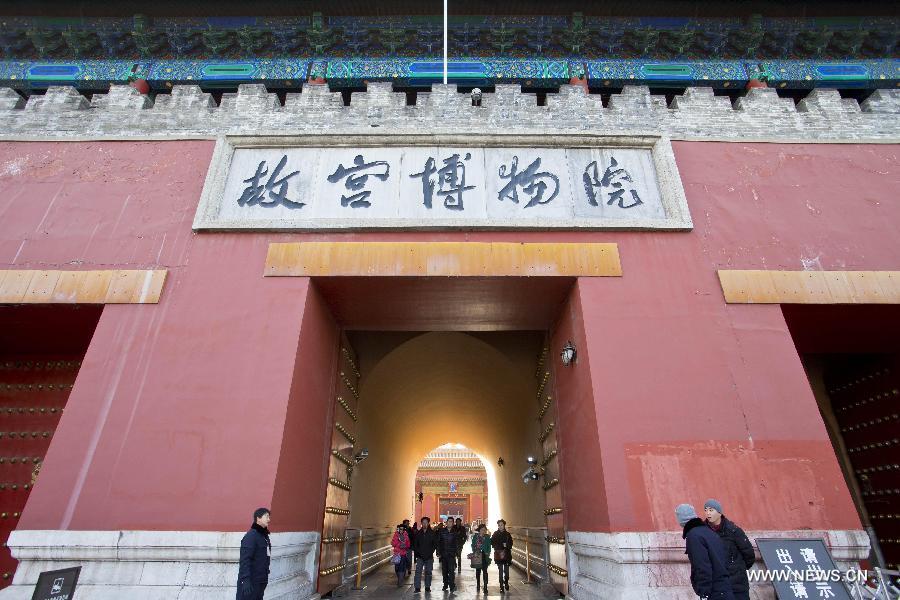 Tourists walk out of the Shenwu Gate of the Forbidden City in Beijing on Dec. 31, 2013. The Forbidden City, also known as the Palace Museum, will be closed on Mondays since Jan. 1, 2014. But on public days and Mondays during July 1 to Aug. 31, the museum will still be opened. (Xinhua/Zhao Bing)