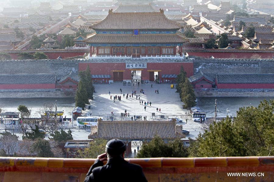 Photo taken on Dec. 31, 2013 shows the bird's-eye view of the Forbidden City in Beijing. The Forbidden City, also known as the Palace Museum, will be closed on Mondays since Jan. 1, 2014. But on public days and Mondays during July 1 to Aug. 31, the museum will still be opened. (Xinhua/Zhao Bing)
