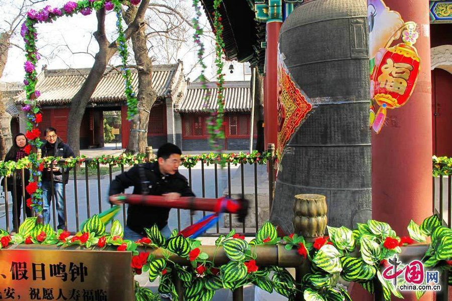 People visited Yonghe Lamasery to pray for happiness in the new year. The Yonghe Temple , also known as the Palace of Peace and Harmony Lama Temple, the Yonghe Lamasery, or most popularly, the Lama Temple is a temple and monastery of the Geluk School of Tibetan Buddhism located in the northeastern part of Beijing, China. [Photo:China.org.cn]