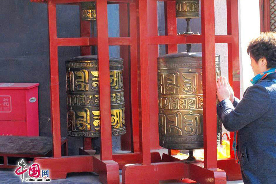 People visited Yonghe Lamasery to pray for happiness in the new year. The Yonghe Temple , also known as the Palace of Peace and Harmony Lama Temple, the Yonghe Lamasery, or most popularly, the Lama Temple is a temple and monastery of the Geluk School of Tibetan Buddhism located in the northeastern part of Beijing, China. [Photo:China.org.cn]