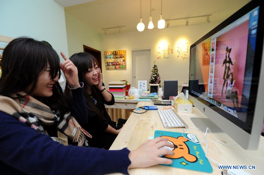 Two costomers laugh after seeing their selfies in the computer at the self shooting studio of Ke Yunxia and her partners in Hangzhou, east China's Zhejiang Province, Jan. 4, 2014. The self-shooting studio set up by Ke and her three friends was opened the same day on which "Selfie" was named word of 2013 by Oxford Dictionaries editors in November of 2013. Selfie is not only a popular word, it's also given some graduates new way to establish their own business. In the studio, customers are not only a subject, but also a photographers. They can choose the costumes and props, and then operate the self timer to take photo for themselves. "We also like selfie, it's suitable for youngers because we can feel relaxed without a photographer beside." said Ke. The studio has opened for more than one month, the clients are mostly students of colleges and universities nearby. Ke and her friends know more about what the people in the same age need, and this is the advantage in the development of their bussiness. (Xinhua/Ju Huanzong)