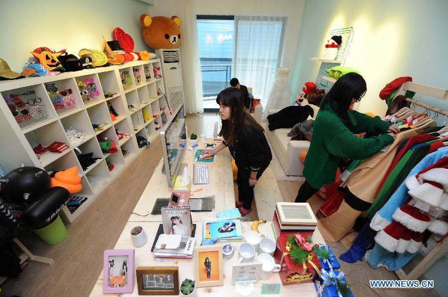 Wang Yao, a partner of Ke Yunxia, serves customers at their studio in Hangzhou, east China's Zhejiang Province, Jan. 4, 2014. The self-shooting studio set up by Ke and her three friends was opened the same day on which "Selfie" was named word of 2013 by Oxford Dictionaries editors in November of 2013. Selfie is not only a popular word, it's also given some graduates new way to establish their own business. In the studio, customers are not only a subject, but also a photographers. They can choose the costumes and props, and then operate the self timer to take photo for themselves. "We also like selfie, it's suitable for youngers because we can feel relaxed without a photographer beside." said Ke. The studio has opened for more than one month, the clients are mostly students of colleges and universities nearby. Ke and her friends know more about what the people in the same age need, and this is the advantage in the development of their bussiness. (Xinhua/Ju Huanzong)