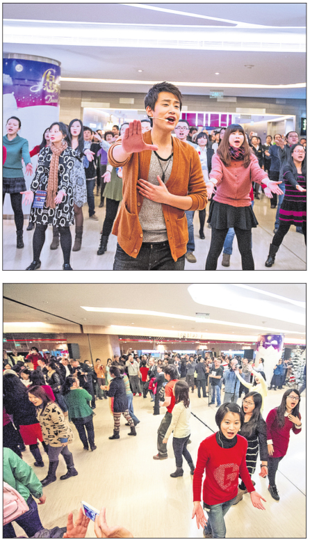 Top and above: Members of three amateur choirs stage a flash-mob performance at the China World Trade Center in Beijing.