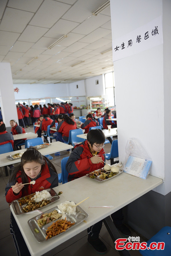 Girl students have dinner at the girl student's area of a canteen in Shuguang High School, Hohhot of Inner Mongolia autonomous region on Jan. 6 2014. To better manage school students, the school made a rule that boy and girl students should have dinner in different areas of the canteen. [Photo: China News Service / Liu Wenhua]