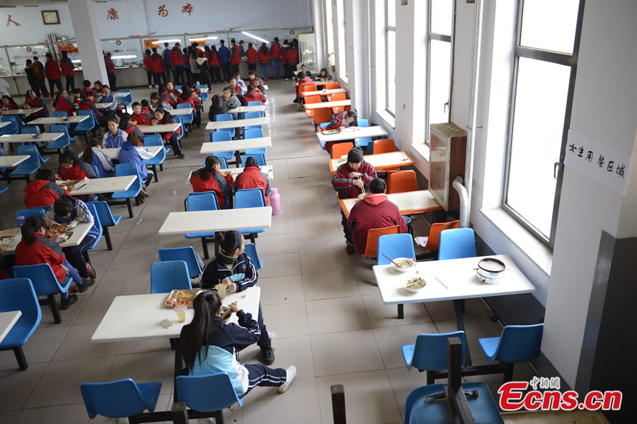 Girl students have dinner at the girl student's area of a canteen in Shuguang High School, Hohhot of Inner Mongolia autonomous region on Jan. 6 2014. To better manage school students, the school made a rule that boy and girl students should have dinner in different areas of the canteen. [Photo: China News Service / Liu Wenhua]