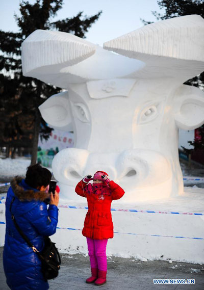 A young girl poses for photos in front of a snow sculpture at the Nanhu Park in Changchun, capital of northeast China's Jilin Province, Jan. 7, 2013. (Xinhua/Xu Chang)