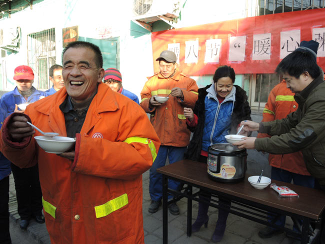 Wang Yuyin (left), a 58-year-old sanitation worker, eats Laba porridge with collages after work in Taiyuan, north China's Shanxi Province, January 5, 2014. The Laba Festival which falls on January 8 this year is regarded as a prelude to the Spring Festival, or Chinese Lunar New Year, the most important occasion of family reunion. Eating Laba porridge on the day of Laba is a traditional custom in China. (Xinhua)